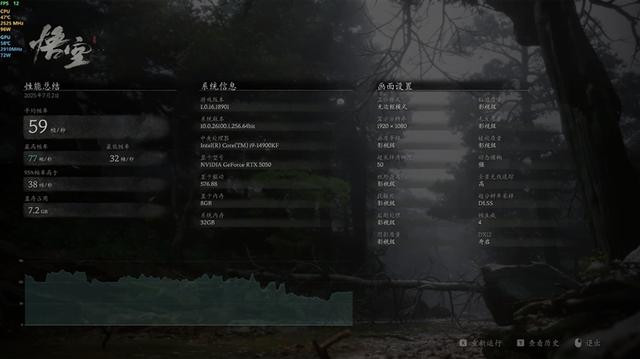 《黑神话·悟空》在开启DLSS 4最高的4X级别多帧生成时,1080P分辨率下平均帧率为59,基本达到了60帧的流畅标准。