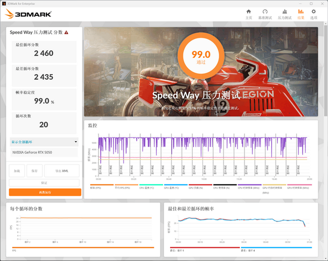 我们使用3DMark进行压力测试,连续运行20轮的Speed Way测试场景,最终测试成绩稳定性为99.0%,最佳成绩和最差成绩之间的差距非常小,帧率曲线上几乎完全重合,在长时间工作时映众RTX 5050曜夜显卡的性能几乎没有波动,运行非常稳定。