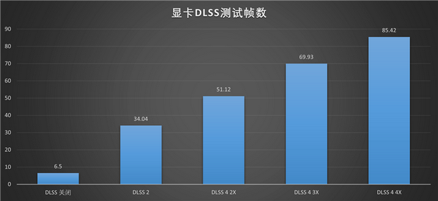 在3Dmark NVIDIA DLSS功能测试中,关闭DLSS 4时帧数为6.5FPS左右,开启DLSS 4 2x之后帧数上升为51.12PS,开启DLSS 4 3x之后帧数上升为69.93FPS,开启DLSS 4 4x之后帧数上升为85.42FPS。