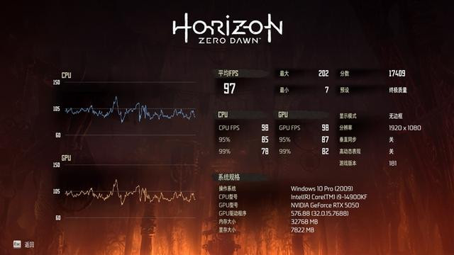 在《地平线:零之曙光》中,使用终极质量画质进行测试,1080P分辨率下平均帧率为97。