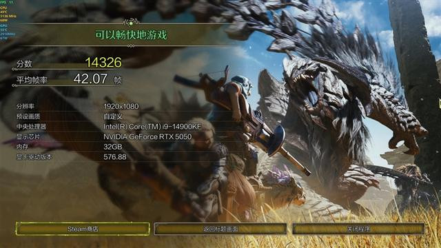 在《古墓丽影:暗影》这类稍老的游戏中,RTX 5050的性能也足够在1080P分辨率下获得上百的帧数,非常流畅,但在《怪物猎人:荒野》中,我们测试无论是否启用DLSS超分辨率或帧生成功能,最终测试帧数差距都不大,在画质设置页面始终提示显存不足,玩家必须舍弃一部分画质来节约显存,获得更好的帧数表现。