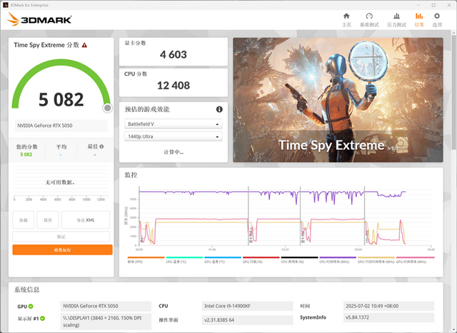 在3DMark的Time Spy Extreme(DX12+4K渲染分辨率)测试中,总成绩为5082,其中显卡分数为4603。