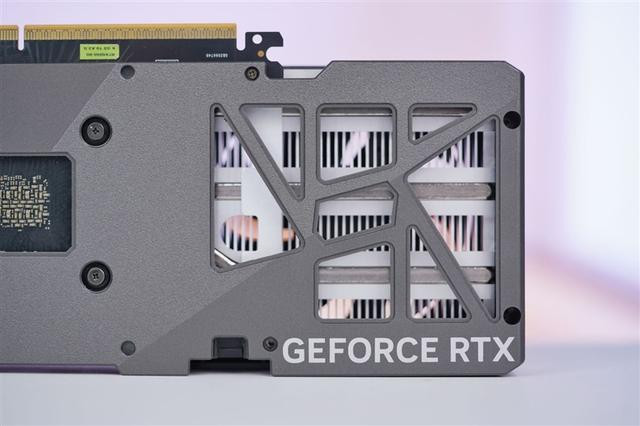映众RTX 5050曜夜显卡背板特写,PC材质的背板同样呈现出金属质感,整体更协调。背板尾部设计有大量几何形镂空,方便轴流风扇气流直接吹透显卡,散热效果更好。