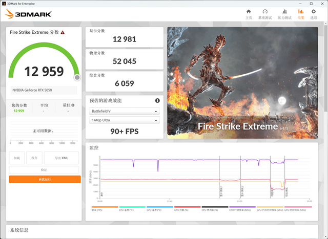 在3DMark的Fire Strike Extreme(DX11+2K渲染分辨率)测试中,总成绩为12959,其中显卡分数为12981。