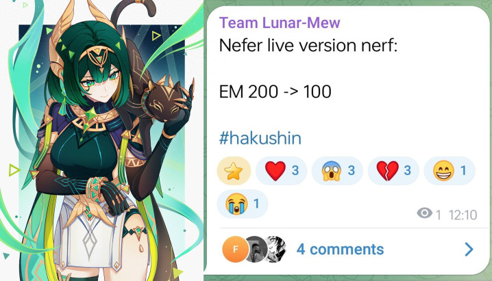 目前已经有玩家计算过,本次削弱的是奈芙尔的精通数值,由200削弱至100!0+1队伍伤害削弱6%左右,高命的话影响不大!之所以要削奈芙尔100精通,个人预测是因为哥伦比娅,少女的定位很可能会是精通拐!