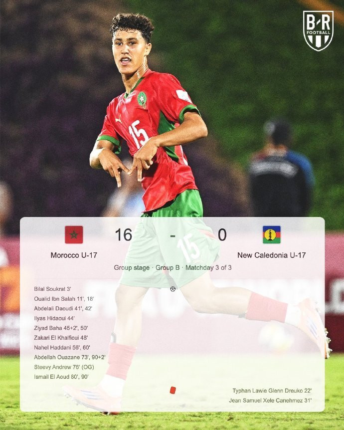 最终9人作战的新喀里多尼亚队上半场便连丢7球,下半场再丢9球,全场比赛,摩洛哥狂轰80脚射门29次射正,最终16-0赢下了这场比赛。而新喀里多尼亚队则是3次射门0射正。