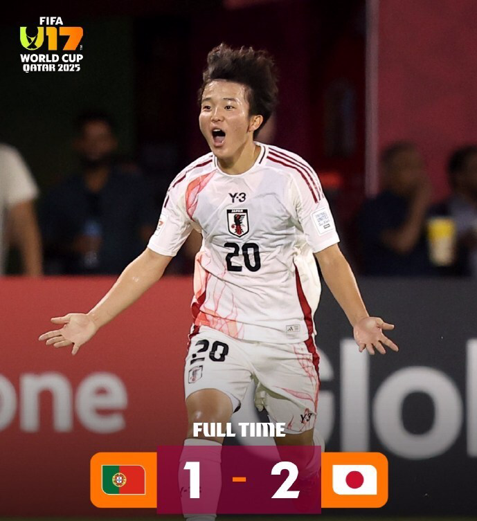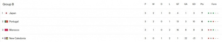 在同组另外1场比赛中,日本2-1力挫葡萄牙,2胜1平积7分获得本组头名,葡萄牙2胜1负积6分获得小组第2,两队携手出线。