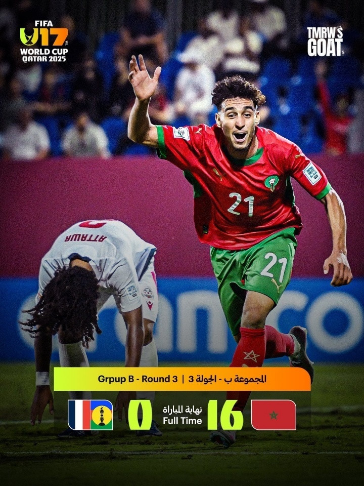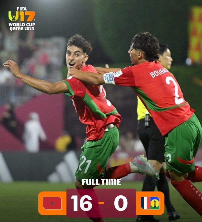 在北京时间11月10日结束的2025年卡塔尔U17世界杯B组末轮一场对决中,人口仅29万的大洋洲岛国新喀里多尼亚队,以0-16溃败给摩洛哥队。以1平2负的战绩,排名小组垫底,无缘出线。