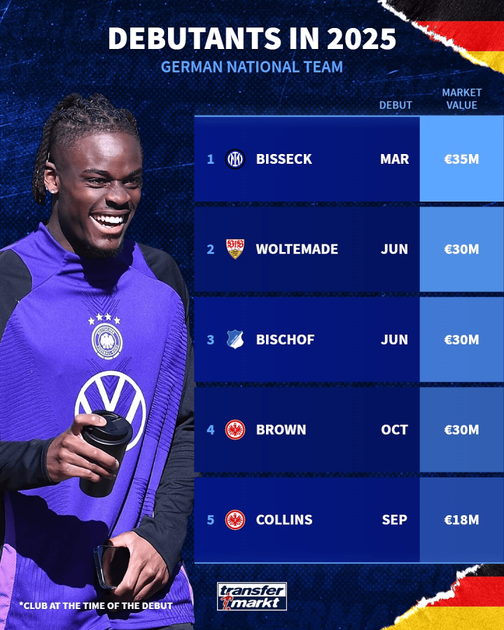 2025年德国国家队新人身价榜: 比塞克居首, 沃尔特马德第二