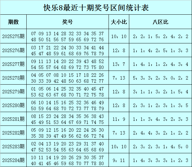 福彩快乐8第2025284期奖号为:10 11 14 19 20 26 29 30 35 37 40 41 45 46 59 68 70 77 78 80,其中奖号大小比为9:11,八区比为1:4:3:3:3:1:2:3。