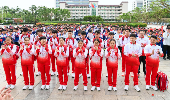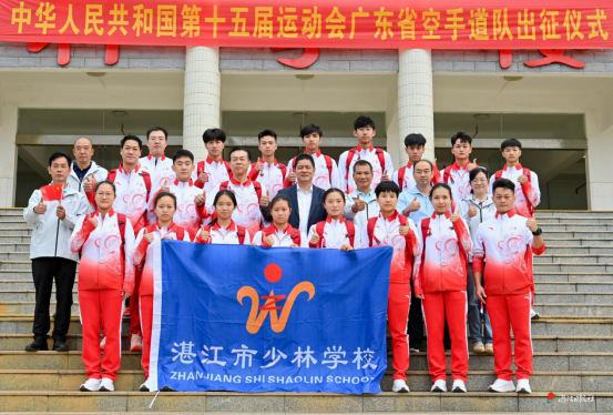 11月3日,湛江市少林学校内锣鼓喧天,醒狮腾跃,第十五届全国运动会群众比赛空手道项目广东省代表队出征仪式在此举行。由1名领队、3名教练、14名运动员及1名队医组成的19人队伍,正式踏上奔赴澳门的决赛征程,将在11月6-8日的澳门综艺馆内,向全运会群众比赛空手道项目奖牌发起冲击。