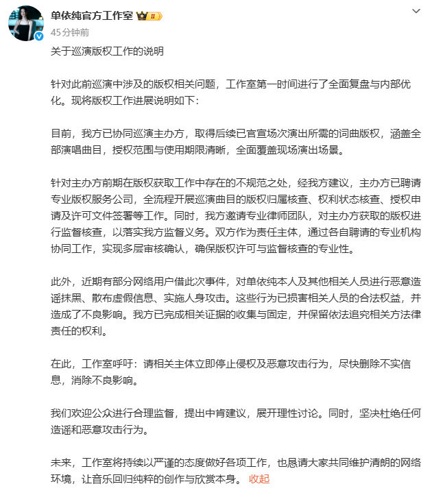 #单依纯演唱会聘请专业版权公司#[#单依纯方再回应演唱会版权争议#]10日,单依纯工作室再次回应此次巡演中出现的涉及版权的问题。工作室表示,现已协同巡演主办方,取得后续已官宣场次演出所需的词曲版权,涵盖全部演唱曲目,授权范围与使用期限清晰,全面覆盖现场演出场景。同时,主办方已聘请专业版权服务公司,全流程开展巡演曲目的版权归属核查、权利状态核查、授权申请及许可文件签署等工作。工作室邀请专业律师团队,对主办方获取的版权进行监督核查。