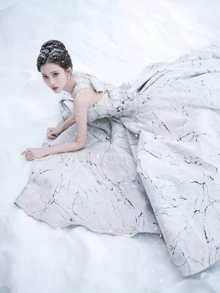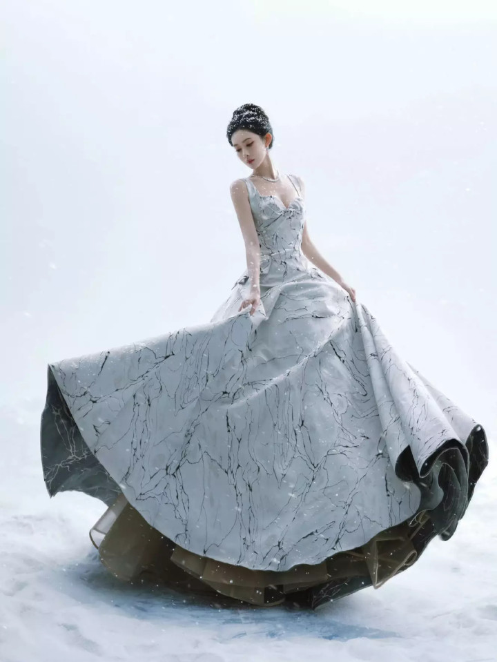 在漫天飞舞的大雪中,她身着一袭长裙,仿佛是从冰雪奇缘里走出的女王。雪花是她最好的滤镜,每一片都落在她温婉的发梢和肩头。